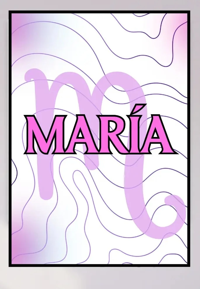 La pieza central que toda fan necesita. Esta lámina individual presenta un diseño minimalista y moderno con ondas estéticas en tonos púrpuras. Personalizamos el fondo con tu signo zodiacal en gran tamaño y superponemos tu nombre con una tipografía K-Pop con bordes definidos. Ideal para enmarcar sola o combinar con tus posters favoritos.