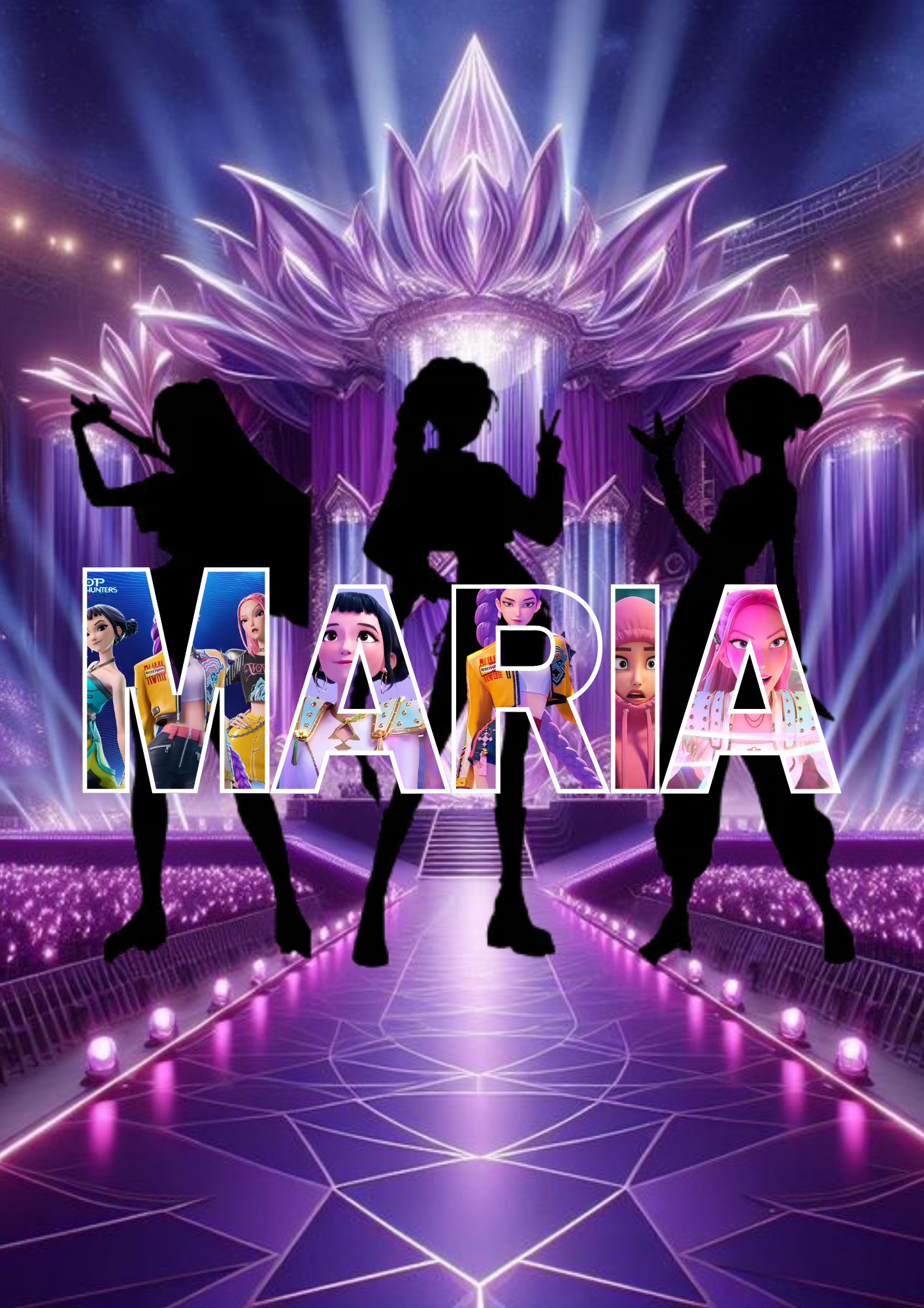 Convierte tu pared en el escenario principal de un concierto. Esta lámina presenta una estética vibrante con una flor de loto central y siluetas de idols en pleno show. Personalizamos el centro con tu nombre utilizando un efecto 'collage' de recortes de revista, fusionando el fan-art con un acabado profesional en tonos púrpuras y magenta.